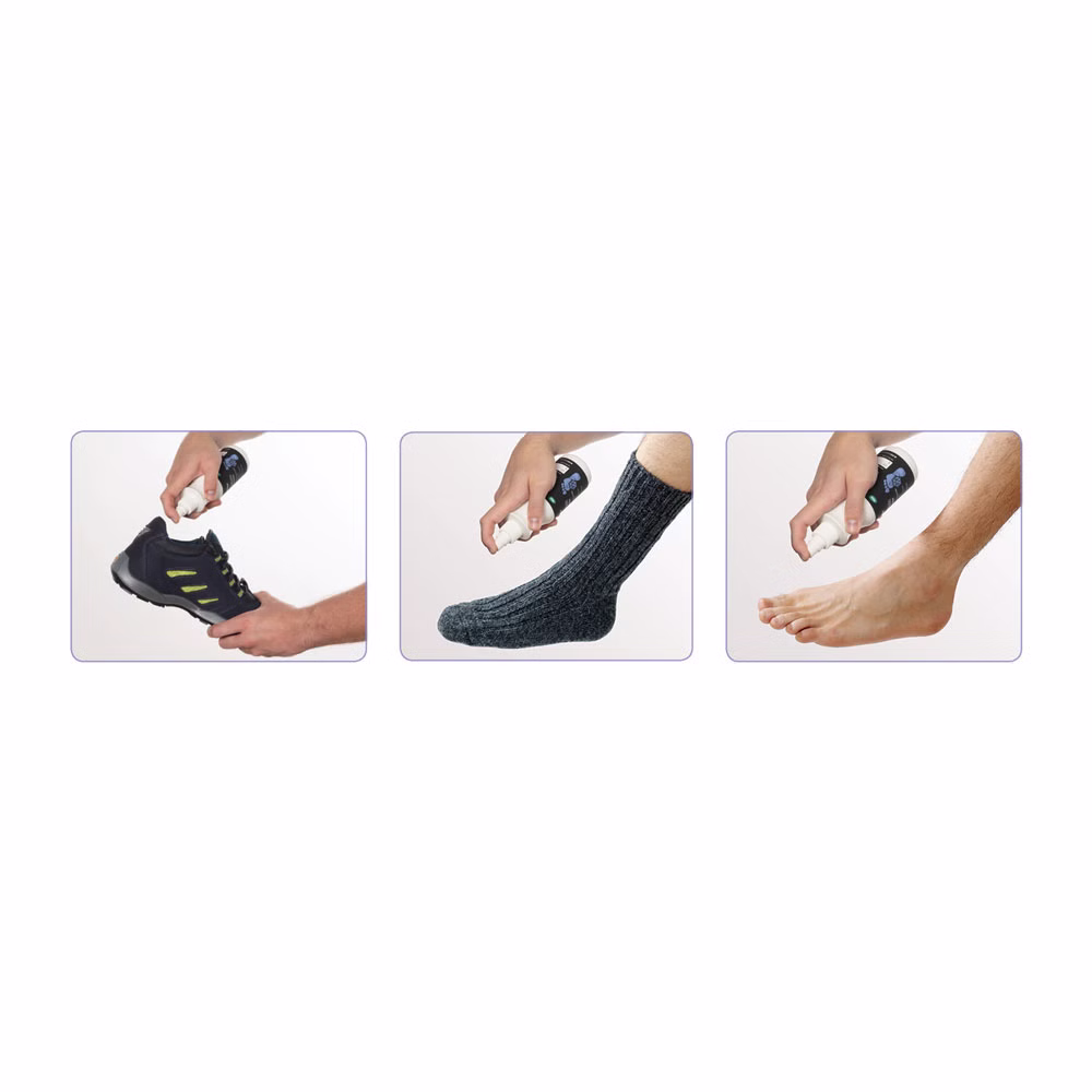 Kleidung bzw. Füße und besonders die Zehenzwischenräume bis zur vollständigen Benetzung mit dem Schuhspray besprühen und mindestens 2 Minuten auftrocknen lassen.