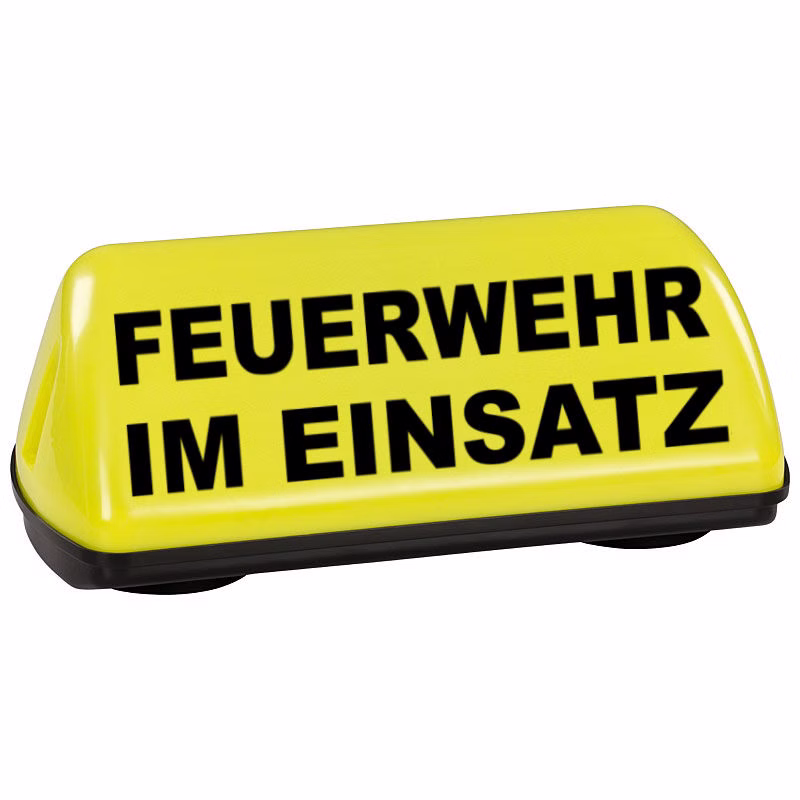 Formschöner und aerodynamischer Dachaufsetzer mit zwei starken, gummierten Ringmagneten und der beidseitigen Beschriftung "FEUERWEHR IM EINSATZ".