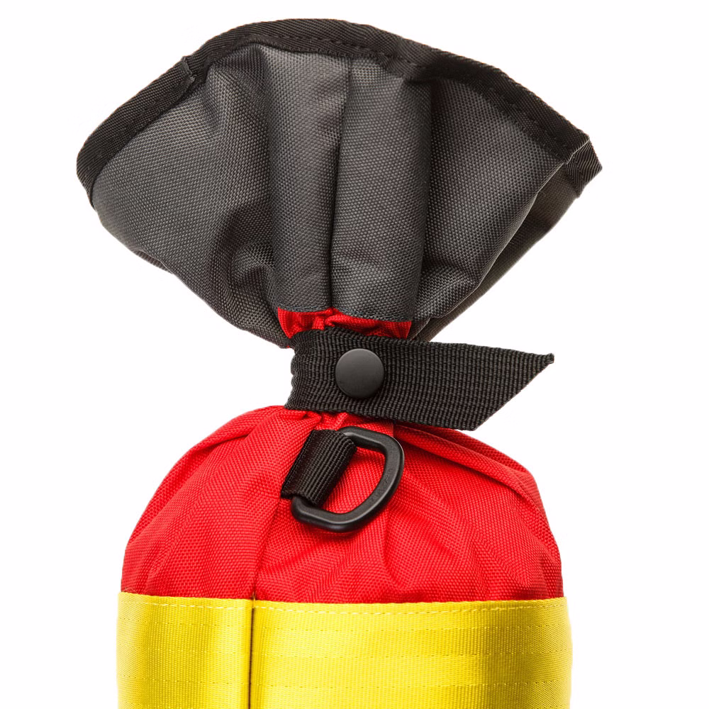 Der Behälter mit extra weiter Füll-Öffnung ist aus griffigem und robustem Nylon, hat einen eingebauten Schwimmkörper und einen Befestigungsring. Mit der auffälligen Rot-Gelb-Kombination ist der Compact Thirty besonders gut zu sehen und wird auch von Laien-Helfern sofort als Rettungsgerät erkannt.