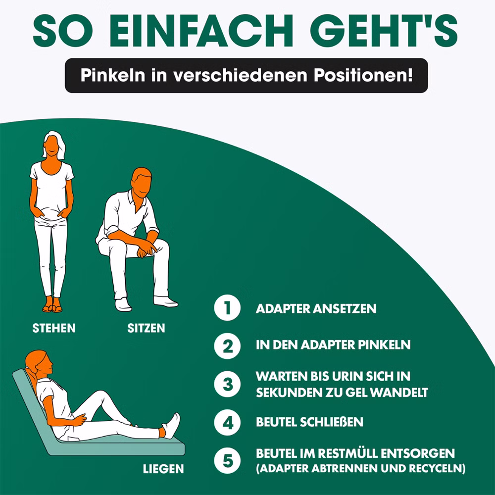 Jeder Beutel hat einen Verschluss, sodass nach dem Gebrauch das Gel nicht ausläuft. Das Fassungsvermögen der Minitoilette beträgt 600ml, so kann der Urinbeutel ganz einfach nochmal benutzt werden, bis das Limit erreicht ist.