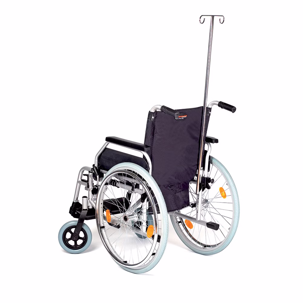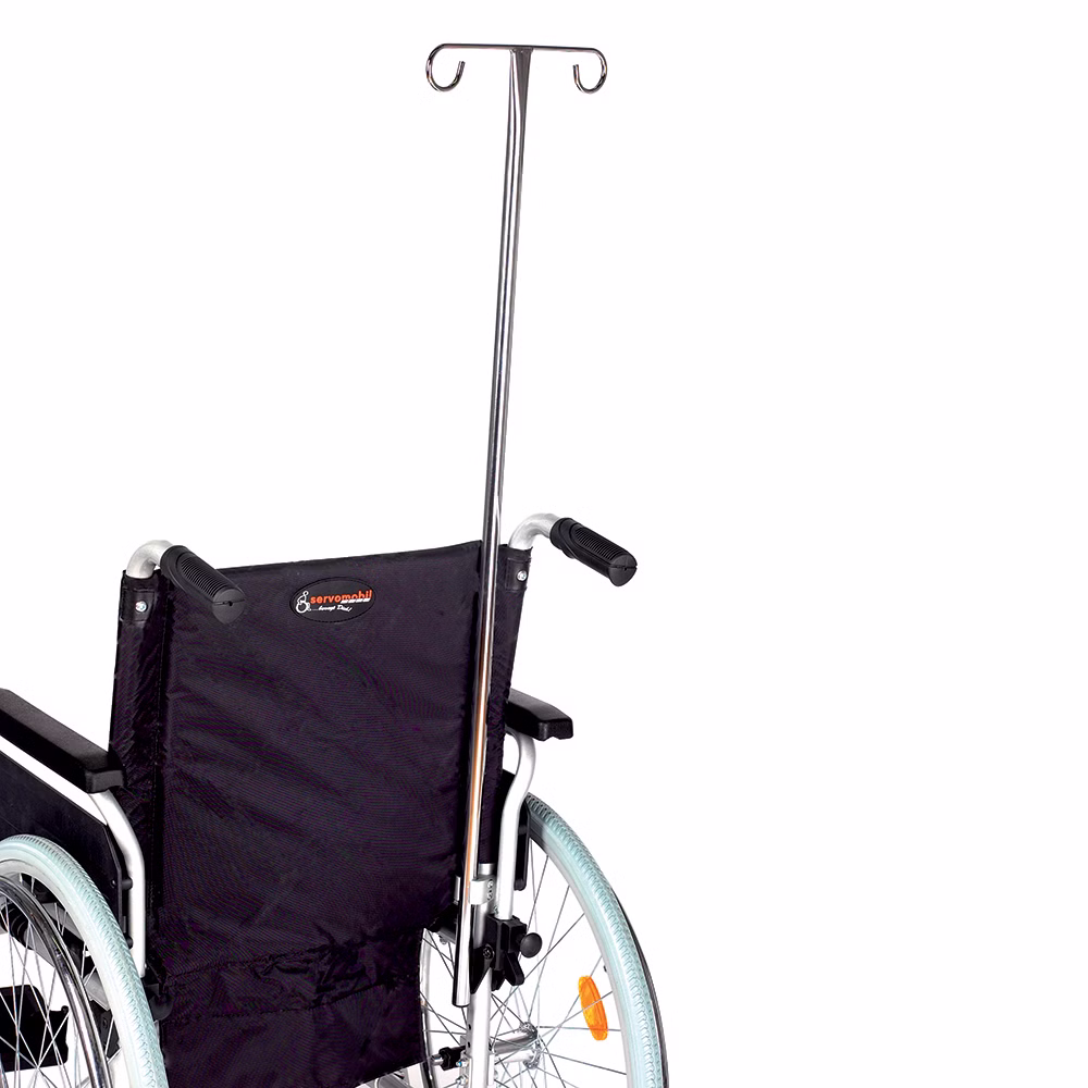 150cm lange Infusionsstange zur Befestigung direkt am Rollstuhl. So muss kein Infusionsständer mitgeführt werden, sondern die Infusion oder Nährlösung kann direkt am Rollstuhl befestigt werden und erhöht den Komfort so deutlich.