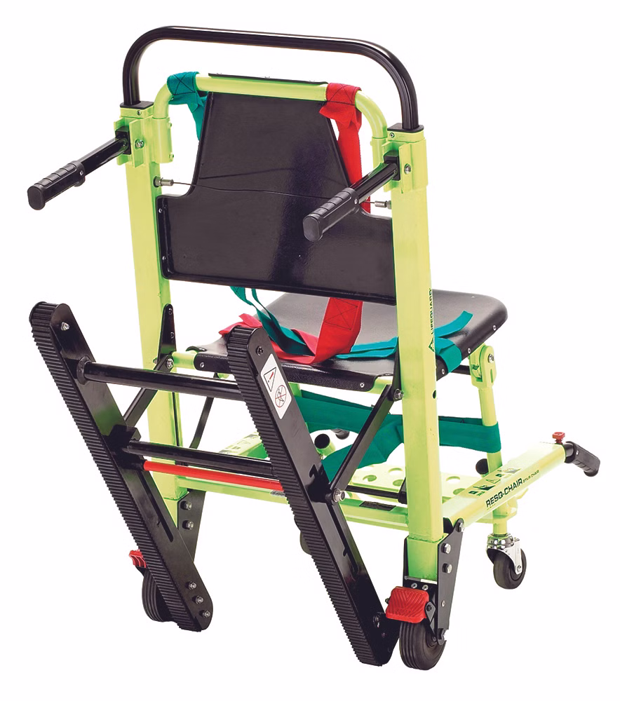 Der RESQ-Chair Tragestuhl ist aus robustem Aluminium gefertigt und zeichnet sich durch seine hohe Belastbarkeit aus. Seine Raupen ermöglichen einen kraftschonenden Treppenabstieg mit dem Patienten und verleihen dem Stuhl zudem ein hohes Maß an Sicherheit. Dank der lenkbaren Rollen vorne, besitzt der Stuhl eine hohe Manövrierfähigkeit. Bei Nichtgebrauch kann der Stuhl platzsparend zusammen geklappt werden. Das Gurtsystem ist farbcodiert für eine leichtere und schnellere Anwendung und eine Kopffixierung sorgt für zusätzlichen Halt des Patienten.