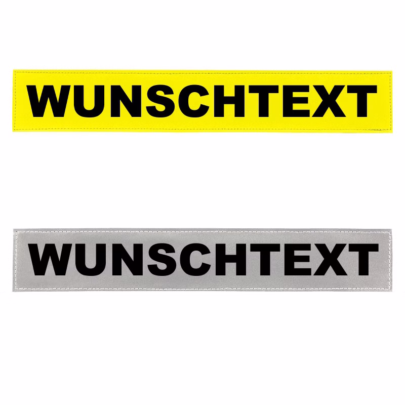 Die Schriftgröße variiert je nach Textlänge und Zeichenart und wird in die Maße des Klettschildes eingepasst.