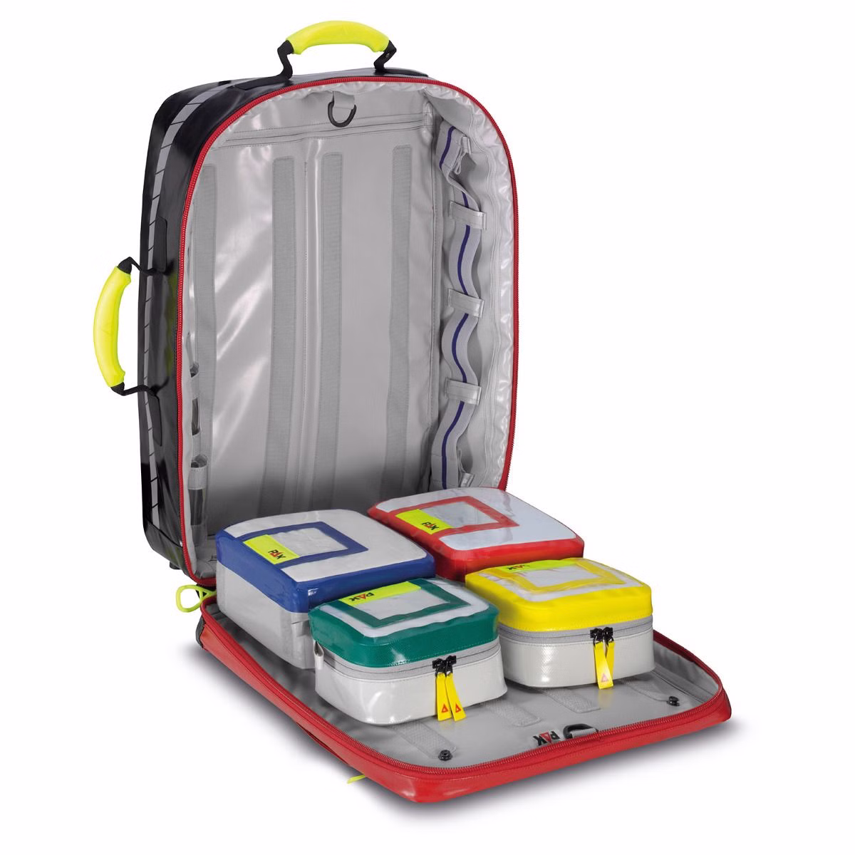 Im Korpus zeigt dieser Rucksack sein wahres Organisationstalent. Man kann die Innentaschen sehr frei im Korpus anordnen. Die hinterlegten und an den Kanten verdeckt eingenähten Klettstreifen halten sie sicher an ihrem Platz. Im Korpusrahmen sind umlaufend einige breite Gummibandschlaufen angebracht. Darin verstaust man z. B. Masken für den schnellen Zugriff. Bei Bedarf nimmt man das Gummiband heraus oder tauscht es aus. Außerdem sind noch flache Klarsichttaschen im Rahmen angebracht. So sind z.B. unsterile Untersuchungshandschuhe direkt parat.