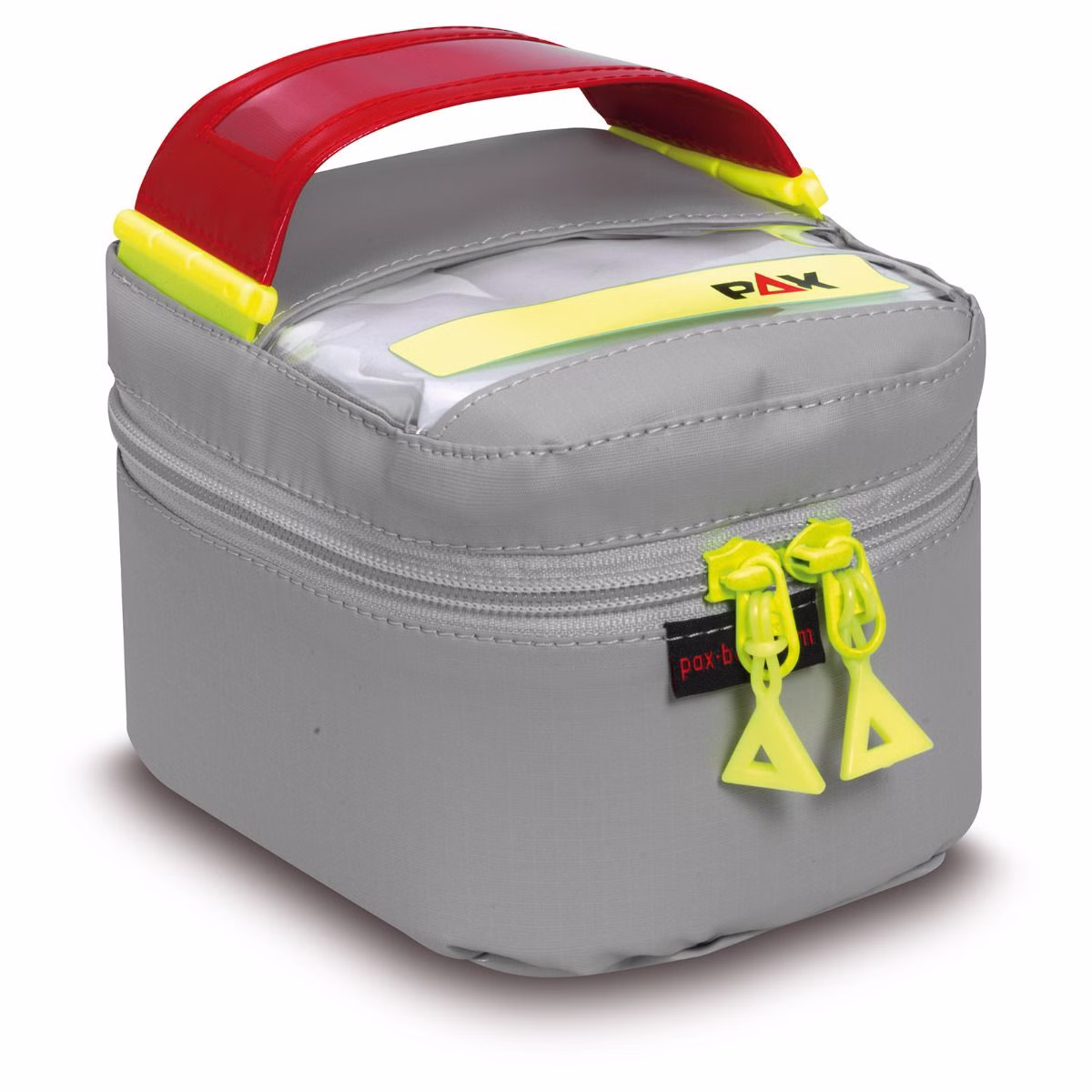 Die Farbgebung der Innentasche erfolgt über den optional erhältlichen farbigen Griff. Ein integriertes Beschriftungsfeld bietet ausreichend Platz für weitere Informationen. Ein entsprechendes Farbschema sorgt im Einsatzfall für eine schnelle Orientierung und damit für eine verbesserte Arbeit am Patienten. Die Befestigung erfolgt über die tagesleuchtgelben Befestigungsschienen.