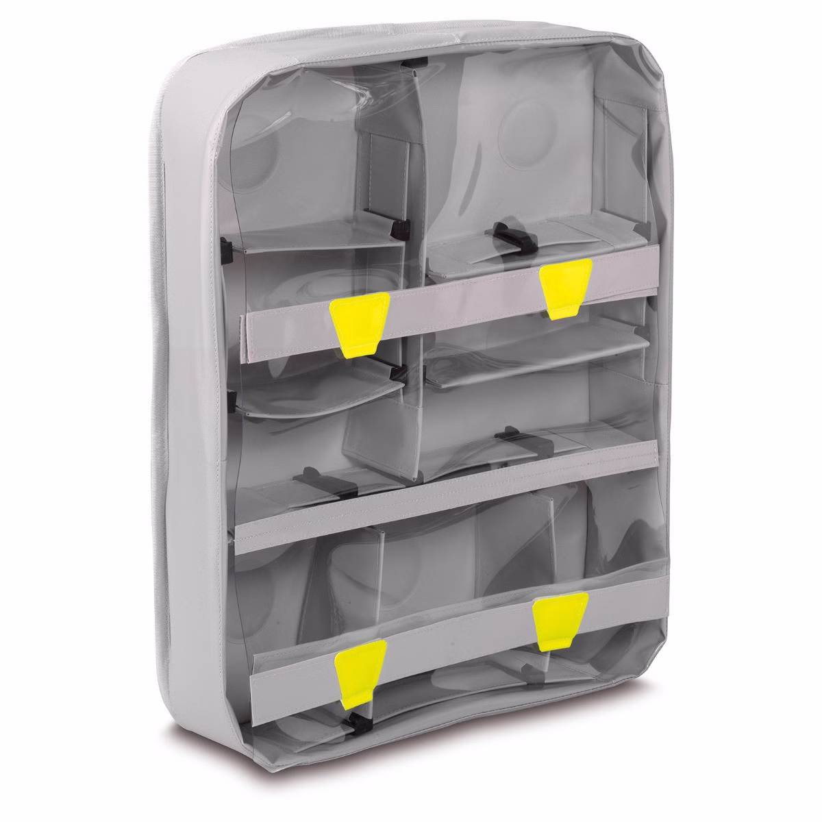 Das großflächige Modul wird vollflächig in die Seite des PAX P5/11 Notfallrucksack gesetzt. Das System nimmt entsprechendes Material gut sichtbar und schnell erreichbar auf. Durch zwei große Klarsichtdeckel mit Magnetverschluss ist das Material vor dem Herausfallen geschützt. Der Innenbereich kann durch die verstellbaren Trennstege individuell auf die jeweiligen Bedürfnisse eingestellt werden.
