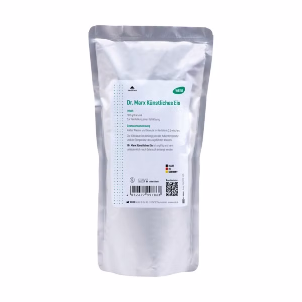 500 Gramm Granulat zur Herstellung einer Kühllösung zur Versorgung von Amputaten. Das Eis kühlt gleichmäßig und rundum, ist ungiftig und absolut ungefährlich und somit optimal geeignet für die Verwendung mit Replantatbeuteln.