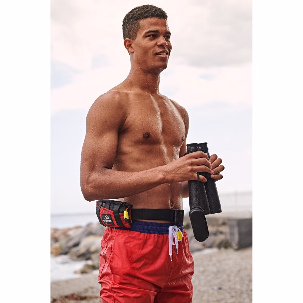 Einfach am Gürtel, an der Hüfte oder auf dem Rücken verstaut tragen und so beide Arme zum schwimmen frei halten. Durch einen Zug am Auslöser bläst sich die gelbe Restube-Boje in Sekunden auf. Dabei hat die Restube Liefeguard einen Auftrieb von 75N und kann so in der Rettung für einen Erwachsenen eingesetzt werden.