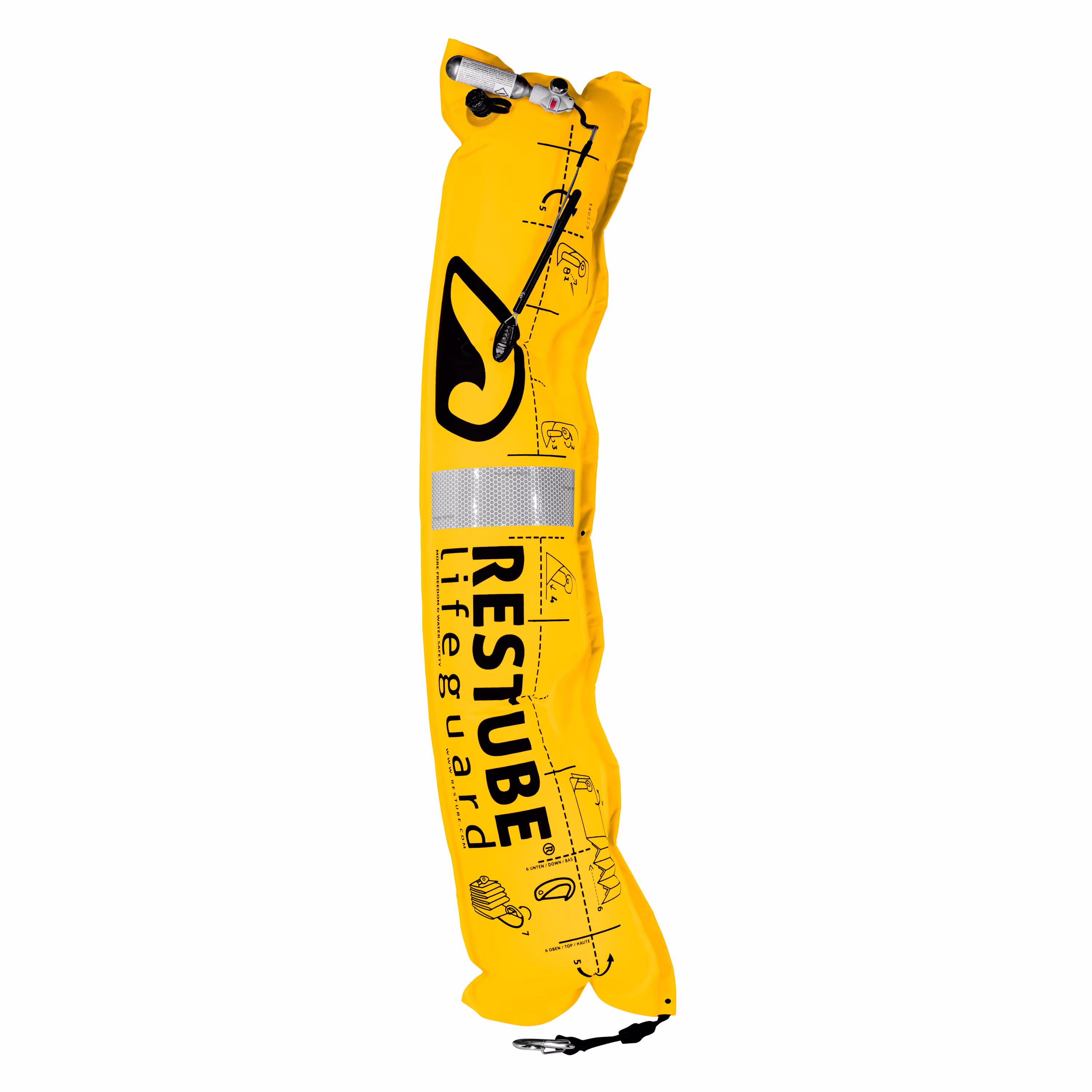 Restube ist wiederverwendbar und wird durch Einschrauben einer neuen, original 16g CO2-Patrone, sofort wieder einsatzbereit. Die Boje lässt sich kinderleicht wieder zusammenpacken.