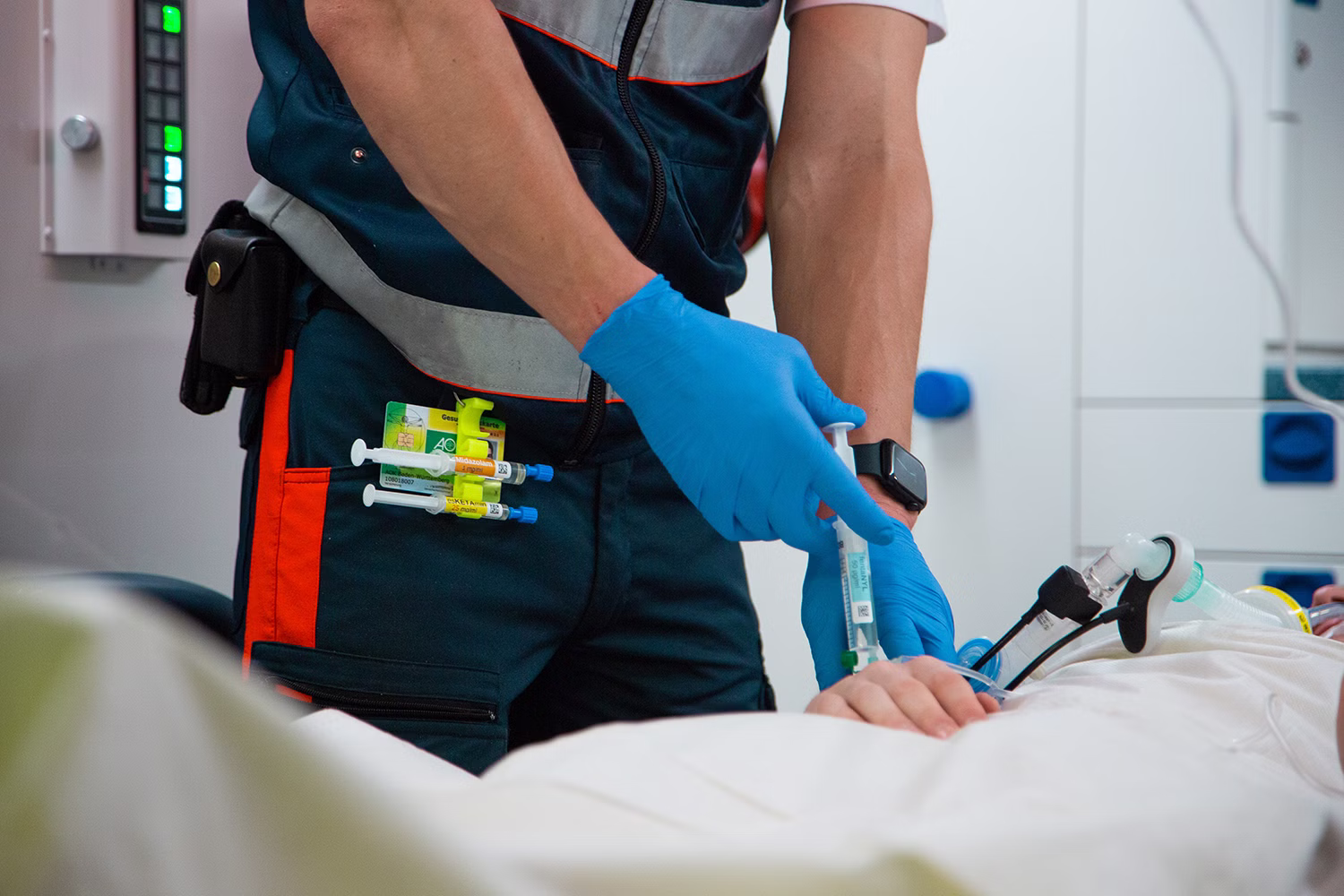 Die Spritzen werden einfach in die jeweilige Halterung geklemmt. Die Krankenkassenkarte wird einfach in den dafür vorgesehenen Schlitz gesteckt.