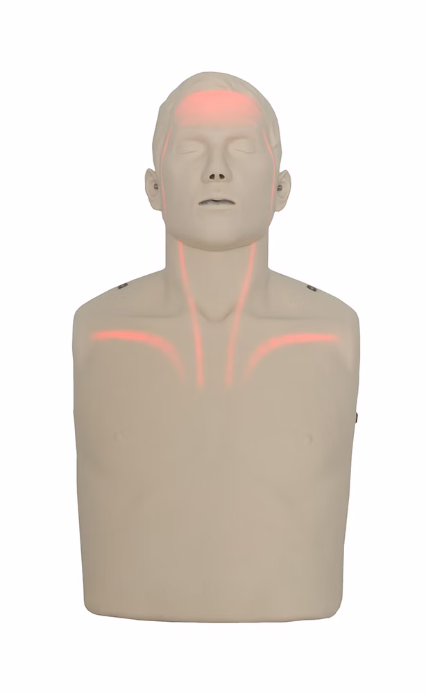 Die HLW-Übungspuppe hat nicht nur eine realitätsgetreue Anatomie des menschlichen Oberkörpers, sondern simuliert bei Thoraxkompressionen zudem den Blutfluss vom Herz zum Gehirn durch Licht. Dies gibt dem Anwender ein sofortiges Feedback über die Effektivität seiner Wiederbelebungsmaßnahmen.