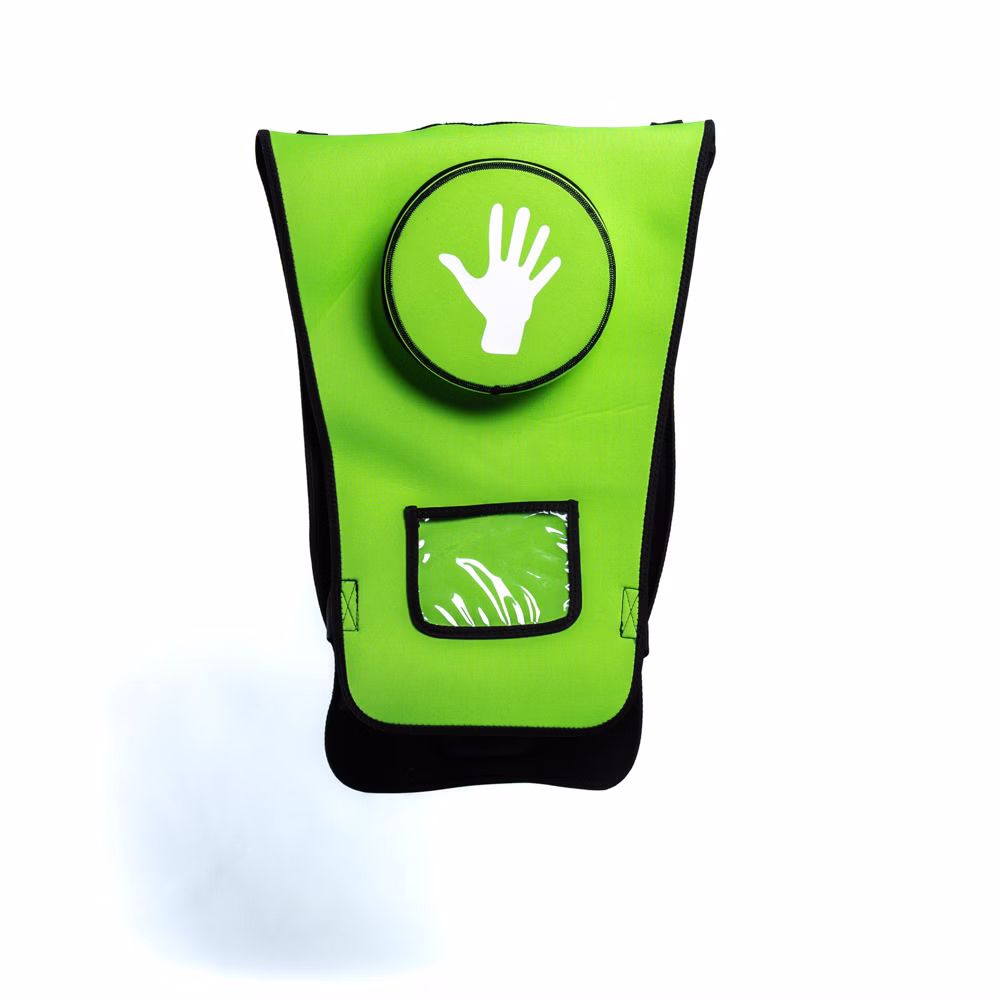 Ein Handsymbol auf einem gepolsterten Schaumstoffkissen auf der Rückseite zeigt die "Schlagposition" für die Rückenschläge an und dämpft diese gleichzeitig. Auf der Vorderseite befindet sich eine Luftblase welche mit einem Schaumstoffball "geladen" wird. Sie simuliert die Atemwege und ermöglicht das Training der Oberbauchkompressionen - dein "Heimlich Handgriff".